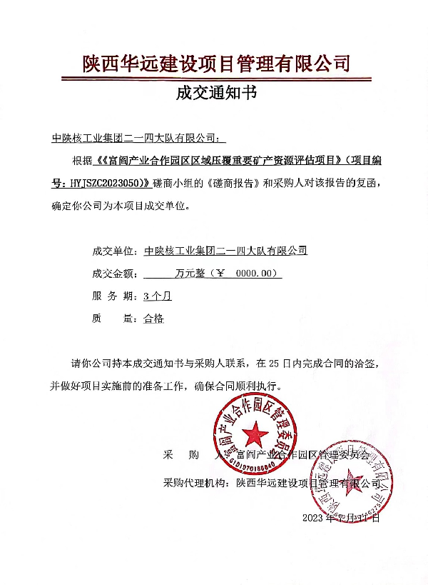 近日,接陜西華遠(yuǎn)建設(shè)項(xiàng)目管理有限公司成交通知,公司成功中標(biāo)《富閻產(chǎn)業(yè)合作園區(qū)區(qū)域壓覆重要礦產(chǎn)資源評(píng)估項(xiàng)目》。